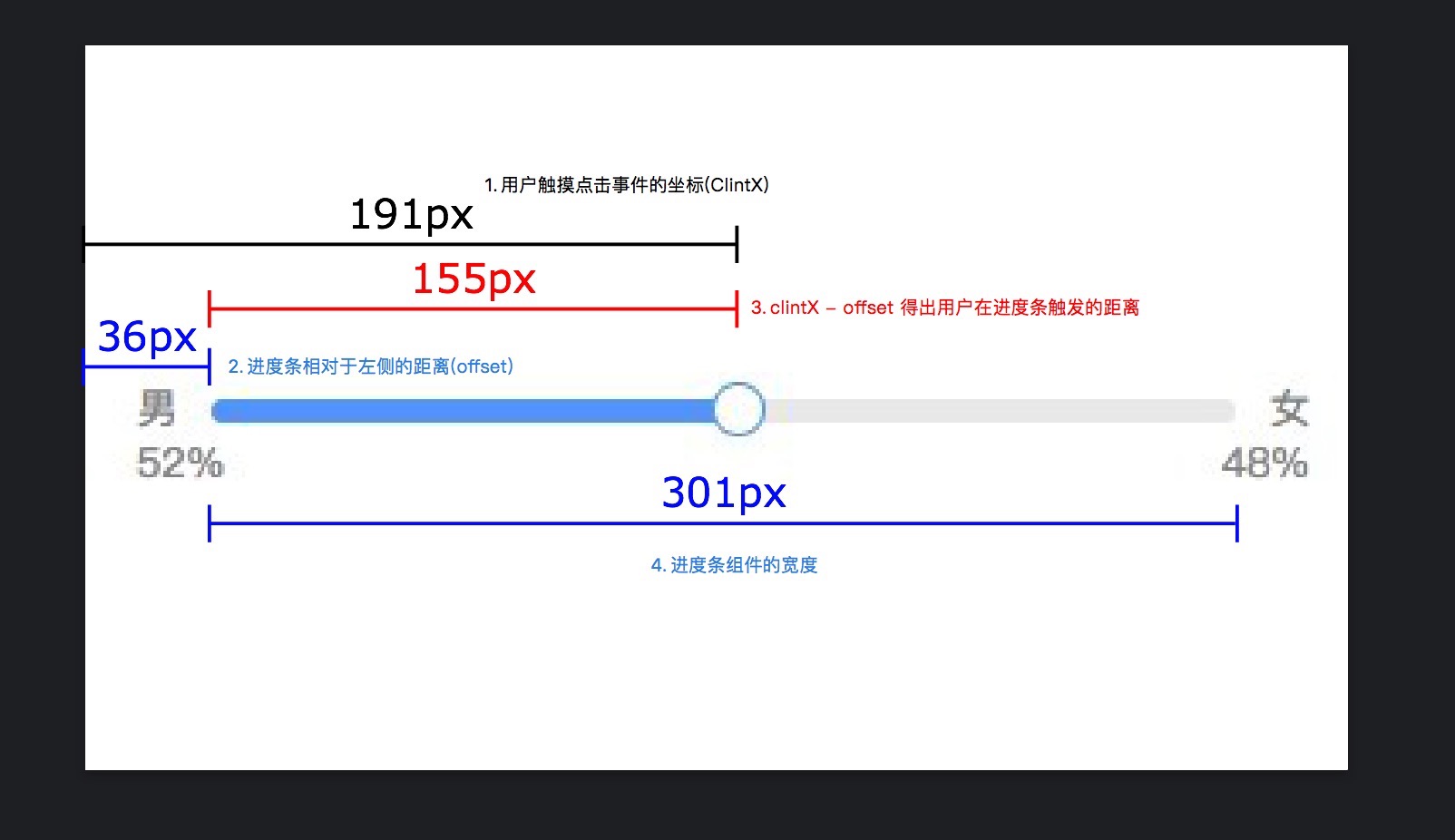 首先先监听touchmove,用户点击滑块后,记录当前的clientX属性, 随后还需要记录当前进度和滑块的偏移量;