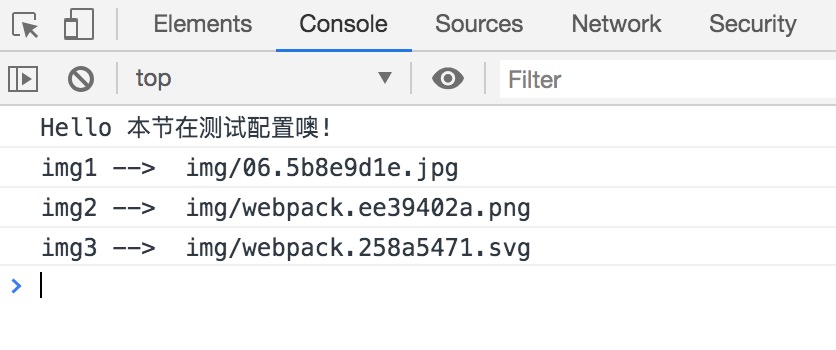 1 2 3 4 5 6 7 8 9 10 import img1 from '../images/06.jpg' ;import img2 from '../images/webpack.jpg' ;import img3 from '../images/webpack.svg' ;log('测试图片引入~' ); console .log('img1 --> ' , img1);console .log('img2 --> ' , img2);console .log('img3 --> ' , img3);